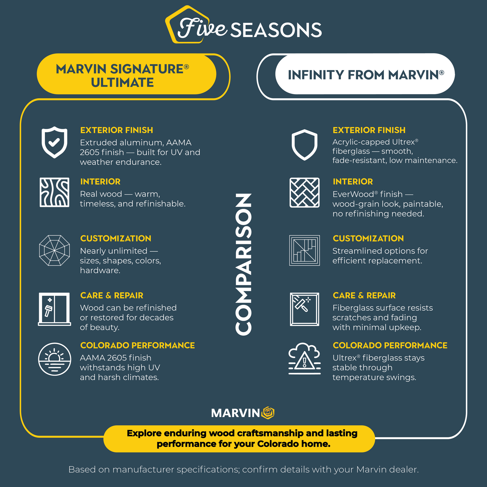 At Five Seasons Windows & Doors, our experience across hundreds of Colorado installations has shown that Marvin Signature® Ultimate consistently delivers the strongest long-term performance in our state’s demanding conditions.