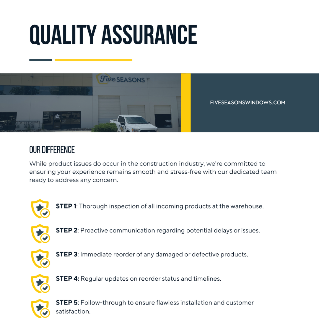 At Five Seasons Windows and Doors, we believe in providing swift, clear communication every step of the way. If an issue arises, you can count on our team to respond quickly and professionally. We’re excited to introduce our upcoming product checking station, where we’ll ensure everything meets our high standards before it reaches your home. Our Final Touch Team is always on hand to provide the extra care needed to guarantee your satisfaction, offering timely solutions and keeping you informed throughout the process.